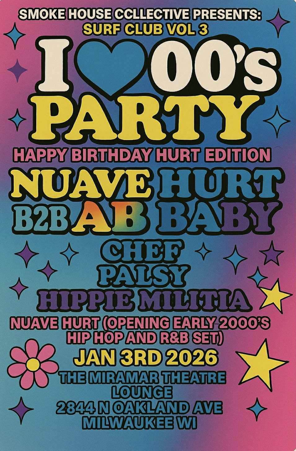 Come with us as we celebrate Nuave Hurts birthday with this 3rd edition of the Surf Club! Early 2000’s themed fashion is suggested not required! NUAVE opening the night with a early 2000’S themed hip hop and R&B with some dope dubstep and more thru out the night as we have HIPPIE MILITIA CHEF PALSY AND AB BABY GOING B2B WITH NUAVE HURT to end the night off strong! Come help us celebrate with HURT!